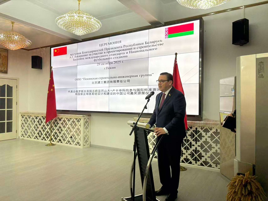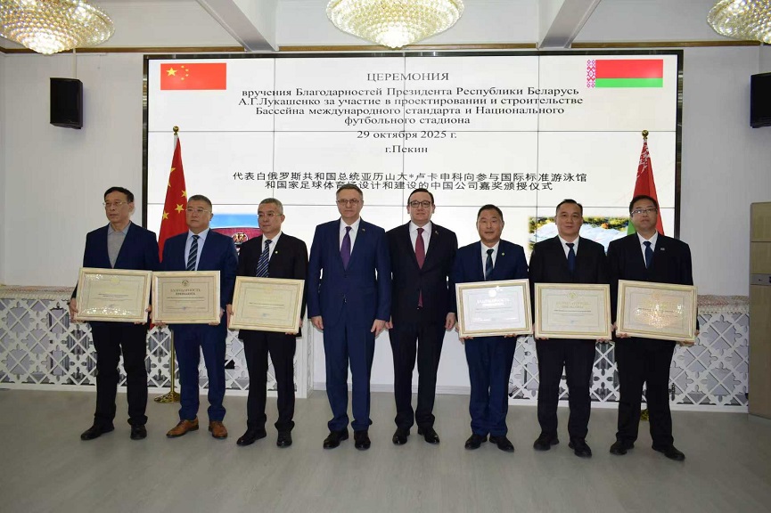 在白俄罗斯驻华大使馆举行了代表白俄罗斯共和国总统亚历山大*卢卡申科向参与国际标准游泳馆和国家足球体育场设计和建设的中国公司表示感谢的仪式。白俄罗斯驻华大使欢迎中国主要承包商代表,感谢他们的专业精神、经验和辛勤工作,使白俄罗斯拥有了世界级的现代化体育设施。